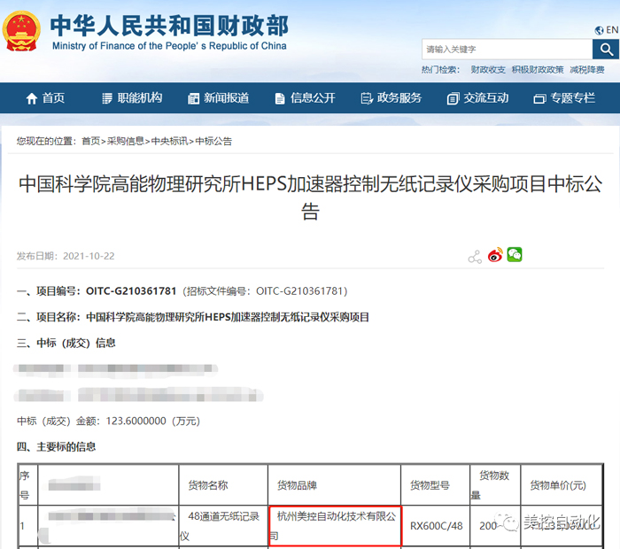 10月22日,中國科學院高能物理研究所HEPS加速器控制無紙記錄儀采購項目正式發(fā)布中標公告,杭州美控自動化技術(shù)有限公司儀表成功“中標”。