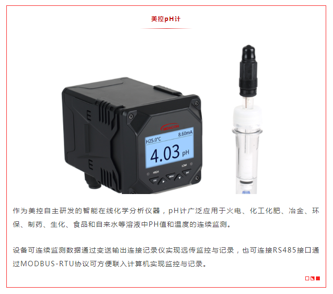 作為美控自主研發(fā)的智能在線化學(xué)分析儀器,pH計廣泛應(yīng)用于火電、化工化肥、冶金、環(huán)保、制藥、生化、食品和自來水等溶液中PH值和溫度的連續(xù)監(jiān)測。