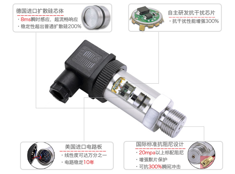 即使壓力傳感器測(cè)壓的過(guò)載計(jì)劃最高可以抵達(dá)50%(超出最大量程的比率),從設(shè)備工作的安全視點(diǎn)考慮也應(yīng)當(dāng)盡量防止冒險(xiǎn),最佳選擇被測(cè)壓力處于量程范圍以內(nèi)的傳感器。在通常情況下,所選傳感器的最佳量程應(yīng)當(dāng)是被測(cè)壓力的2倍,美控壓力變送器可抗300%瞬間沖擊。這么即使傳感器在極高的壓力下工作,也能防止壓力傳感器遭到損壞。