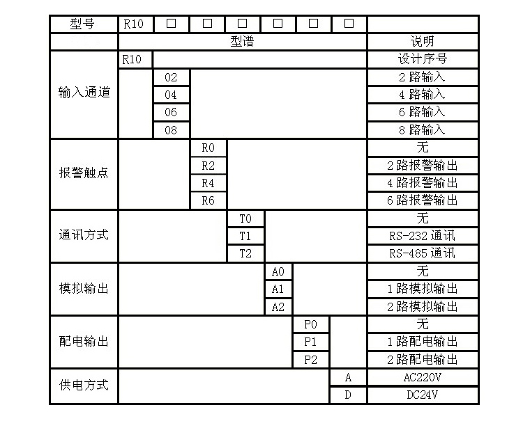 例:RX1005-R2-T2-A0-P0-A 表示: 5通道,2報(bào)警,RS-485通訊,220V供電。